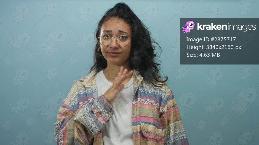 Young hispanic woman wearing glasses and patterned shirt with hand on chest and palm raised in blue studio; disgust refusal.