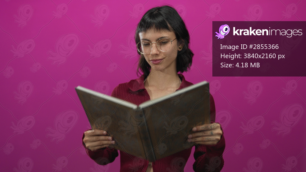 Young hispanic woman wearing glasses peeks over book with hands against pink studio backdrop; curiosity.