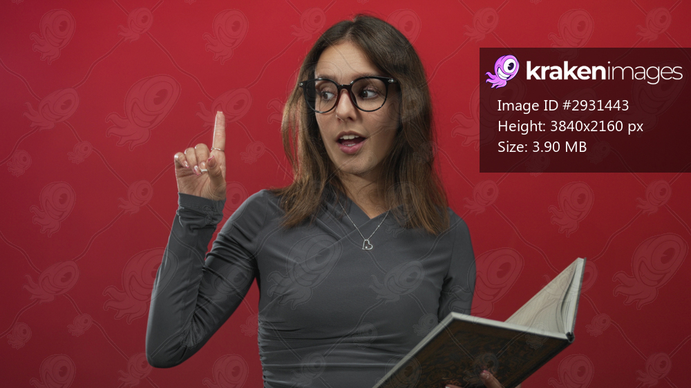 Young hispanic woman wearing glasses pointing finger while holding open book in studio against a red wall; curiosity.