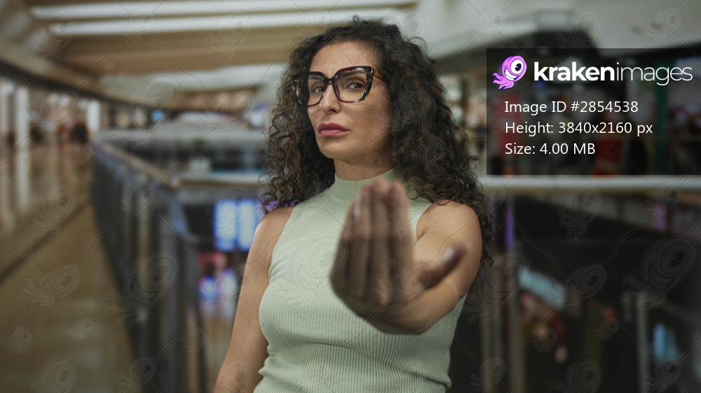 Young hispanic woman wearing glasses points finger in beckoning gesture in mall corridor; invitation confidence.