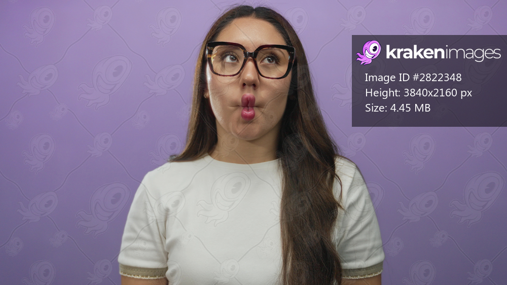 Young hispanic woman wearing glasses purses lips in purple studio; creative self expression playfulness.