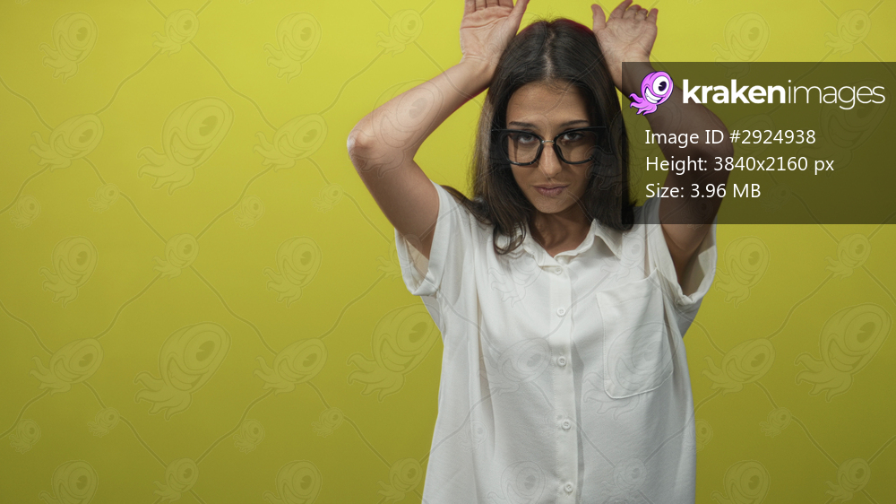 Young hispanic woman wearing glasses raising hands to head with forearms visible and slight smile in yellow studio; playful curiosity.