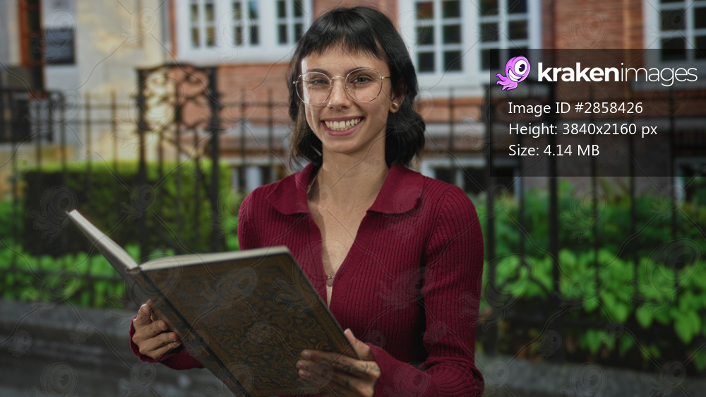Young hispanic woman wearing glasses reading book on street with brick building facade behind; curiosity.