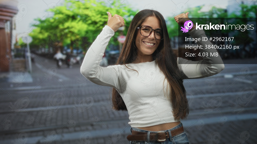 Young hispanic woman wearing glasses smiles and gives thumbs up with bare hands on an urban street with trees and bikes; confidence positivity.