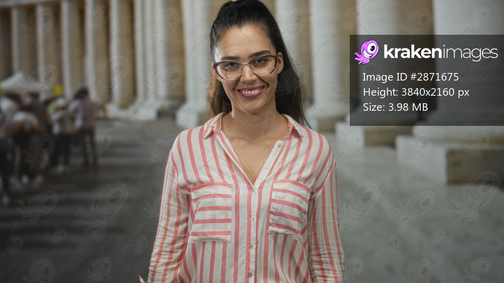 Young hispanic woman wearing glasses smiles in building colonnade among columns and walkers; friendship trust.