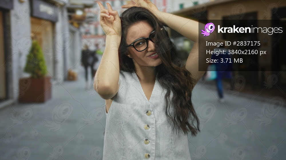 Young hispanic woman wearing glasses smiles and makes bunny ears gesture with both hands on a city street; playfulness joy.
