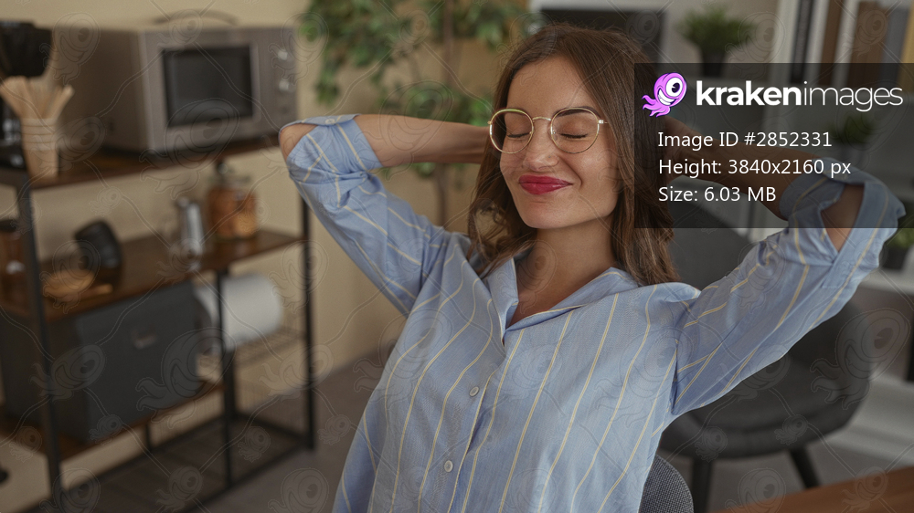 Young hispanic woman wearing glasses stretches arms and leans back in modern office setting; relief.