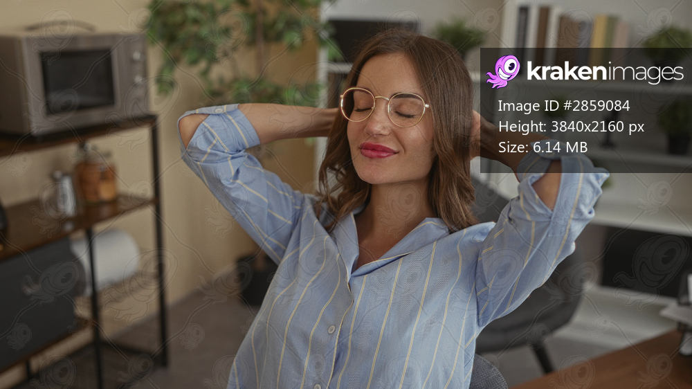 Young hispanic woman wearing glasses stretches arms and leans back in modern office setting; relief.