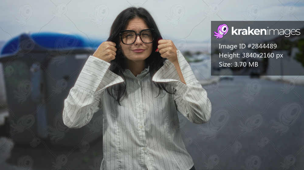 Young hispanic woman wearing glasses and striped shirt gestures crying with fists to eyes on street; sadness.