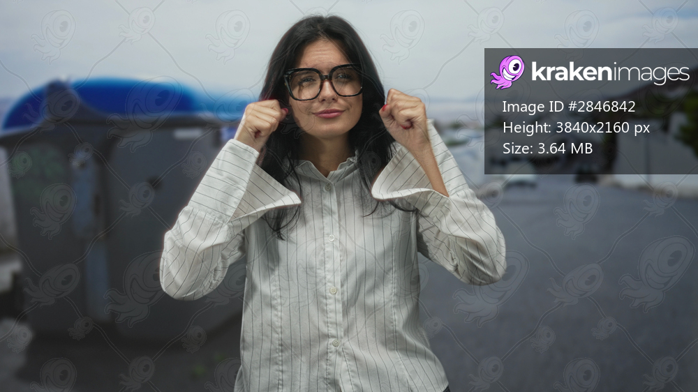 Young hispanic woman wearing glasses and striped shirt gestures crying with fists to eyes on street; sadness.
