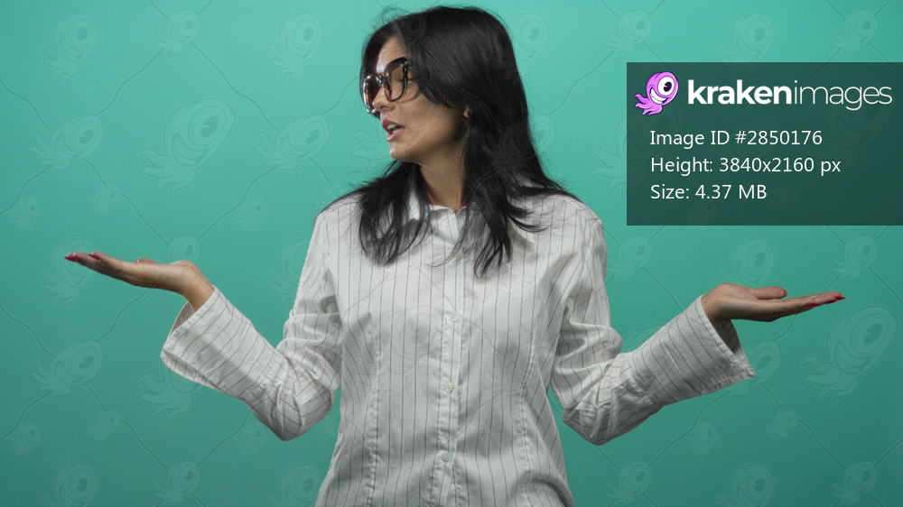 Young hispanic woman wearing glasses and striped shirt holding open palms in a teal studio; uncertainty.