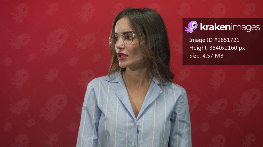 Young hispanic woman wearing glasses and striped shirt pinches nose in studio with red wall; disgust.