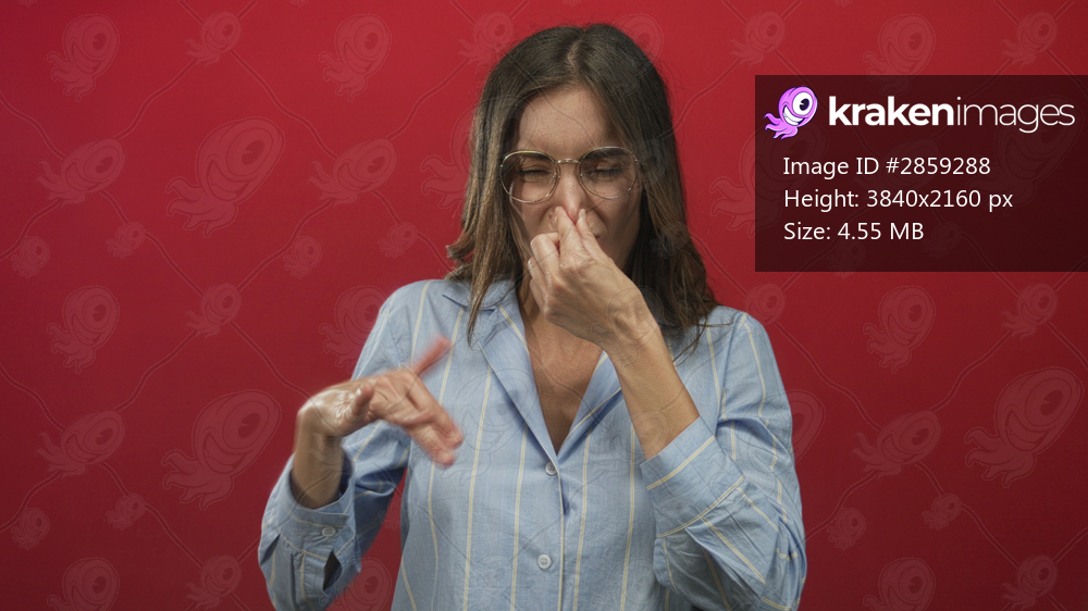 Young hispanic woman wearing glasses and striped shirt pinches nose in studio with red wall; disgust.