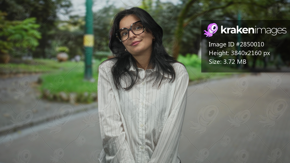 Young hispanic woman wearing glasses tilts head with a slight smile on urban street; quiet contemplation.