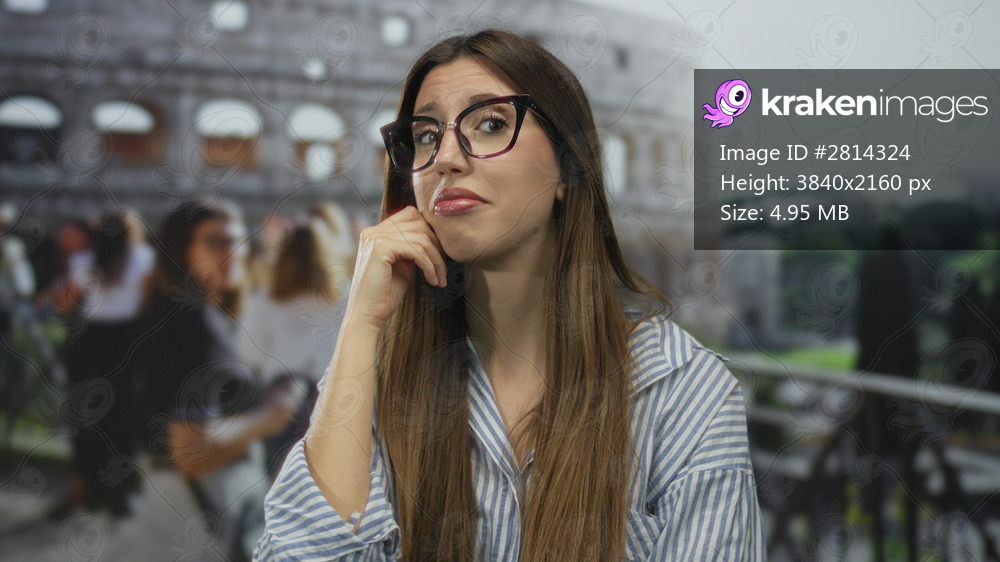Young hispanic woman wearing glasses touches forehead with hand amid blurred crowd in building; frustration.