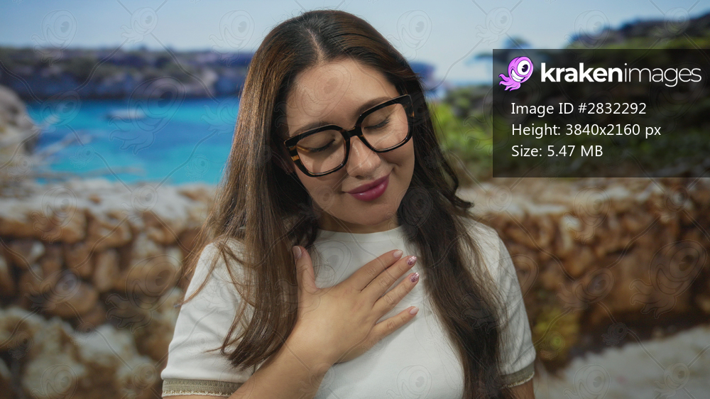 Young hispanic woman wearing glasses and white shirt hand on chest on street with seaside wall; serenity.
