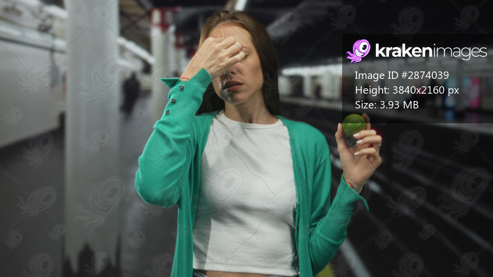 Young hispanic woman wearing green cardigan holding a lime with pinched nose gesture on a subway station platform indoors; disgust reaction.