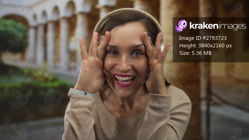 Young hispanic woman wearing headphones covers face with hands in old town street; playful surprise joy.