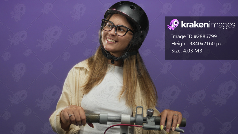 Young hispanic woman wearing helmet and glasses holding scooter handlebars and smiling with visible hands and yellow nails in a purple studio; joy carefree confidence. - Kraken Images