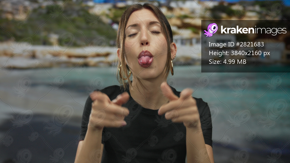 Young hispanic woman wearing hoop earrings and a black shirt points finger and shows tongue in a studio; playful mischief defiance boldness.