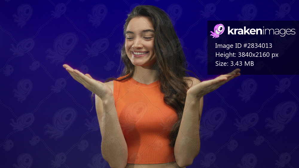 Young hispanic woman wearing orange crop top smiles and presents open palms in studio setting; surprise curiosity.