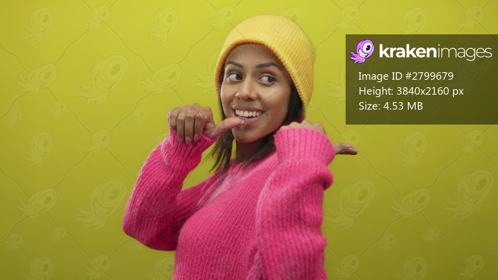 Young hispanic woman wearing pink sweater and yellow hat smiles and points thumbs over shoulder against bright yellow background with playful expression. - Kraken Images