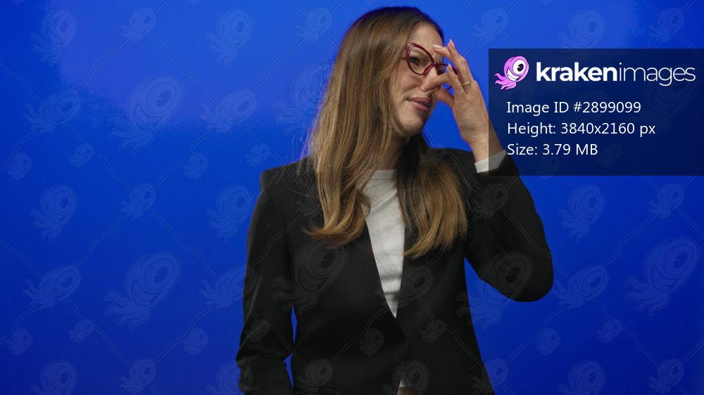 Young hispanic woman wearing red glasses pinches nose and grimaces in blue studio; disgust reaction.