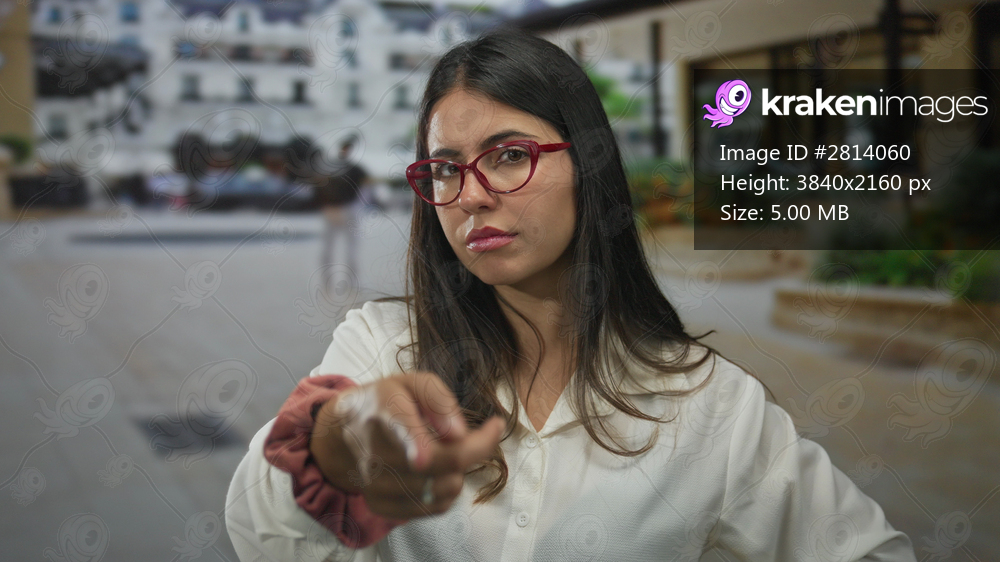 Young hispanic woman wearing red glasses points finger to head then to camera on an urban street outdoors; serious thinking.
