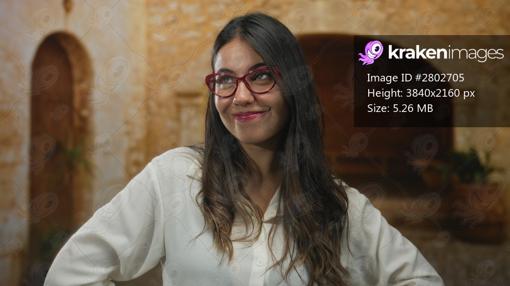 Young hispanic woman wearing red glasses touching lips with finger for silence in old town building; hush.