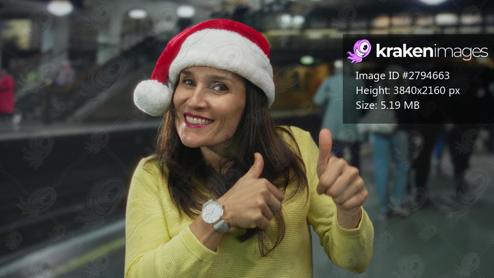 Young hispanic woman wearing red santa hat showing thumbs up gesture at train station platform; holiday cheer optimism.