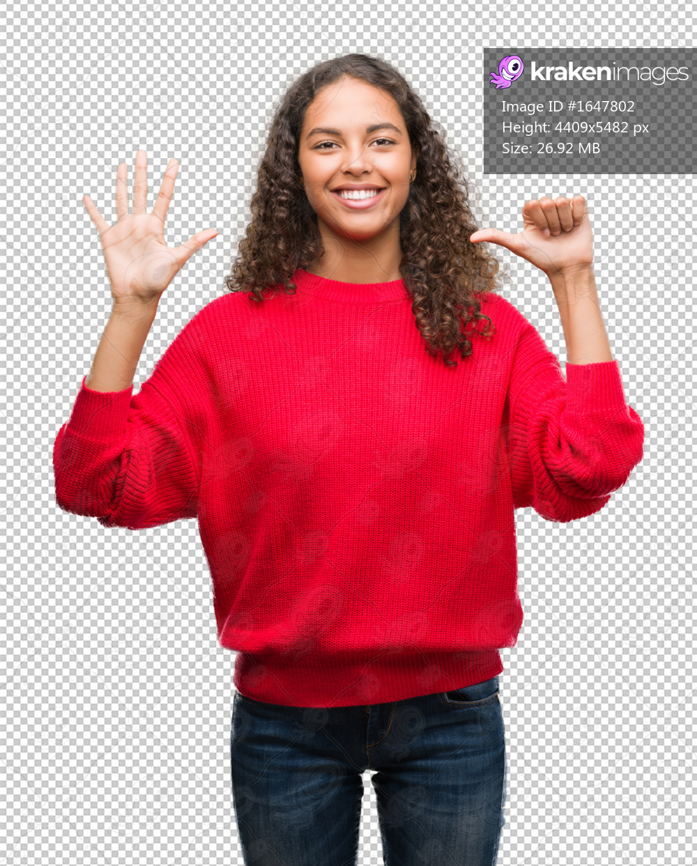 Young hispanic woman wearing red sweater showing and pointing up with fingers number six while smiling confident and happy.
