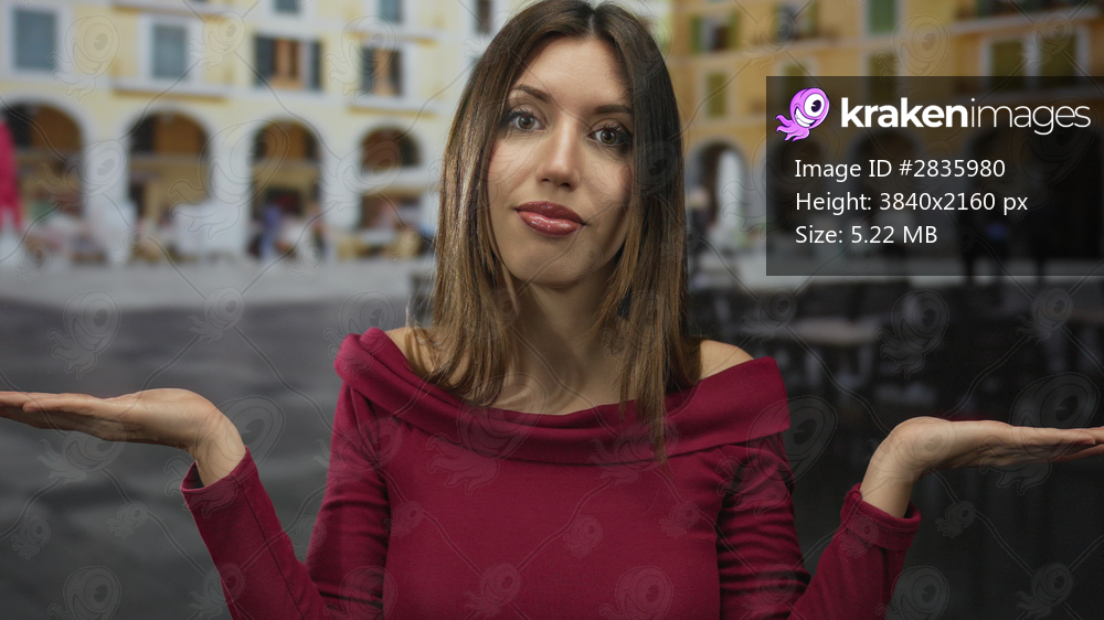 Young hispanic woman wearing red top holds palms up gesture on busy street beside blurred cafe tables; doubt.