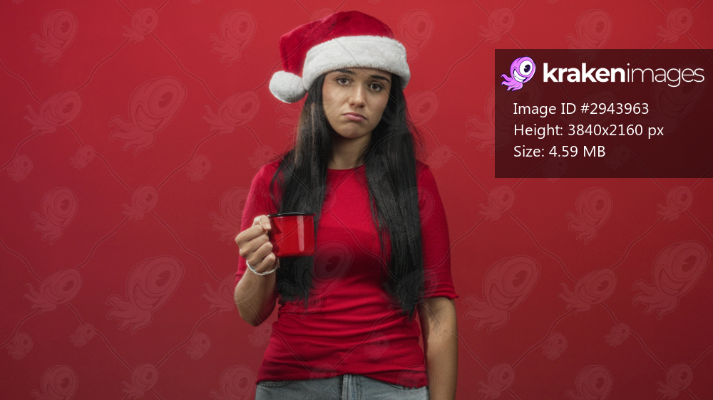 Young hispanic woman wearing red top and santa hat holds red mug with a pout and lowered eyes in studio; holiday sadness.