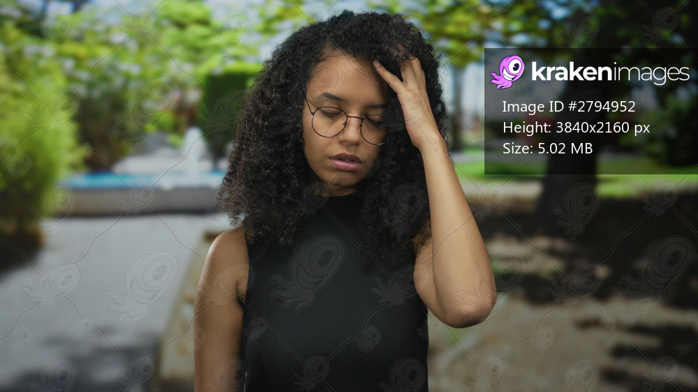 Young hispanic woman wearing round glasses and a black sleeveless top gazes forward in forest; stress.