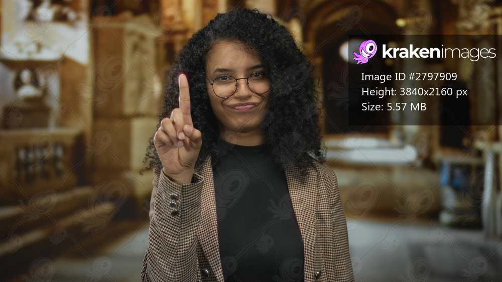 Young hispanic woman wearing round glasses and plaid blazer pointing index finger to herself in ornate church interior; denial.