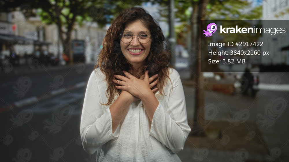 Young hispanic woman wearing round glasses stands with hands crossed over chest on a city street lined with trees and buildings; gratitude sincerity.