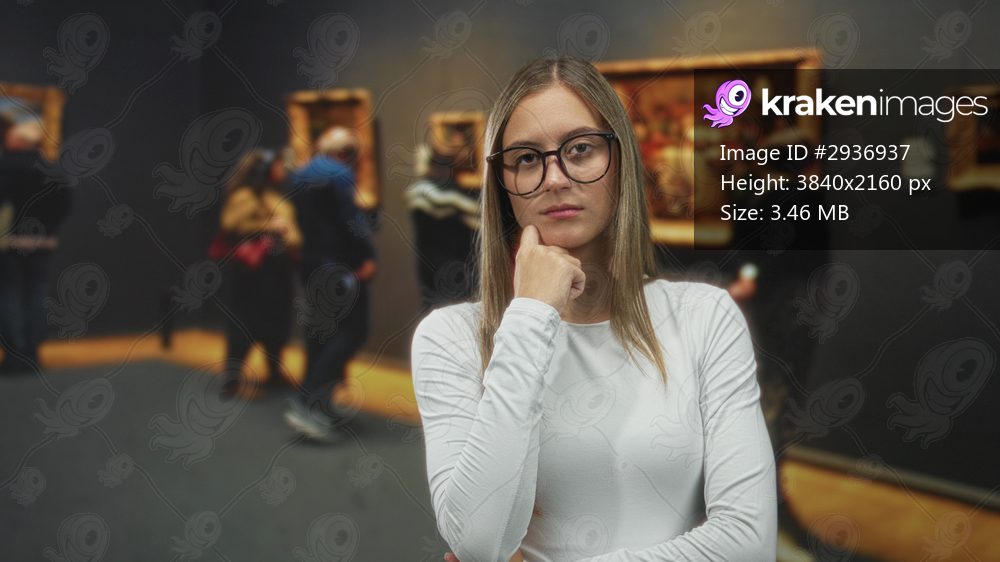 Young hispanic woman wearing round glasses and white shirt with hand on chin in museum gallery; thoughtful curiosity reflection.