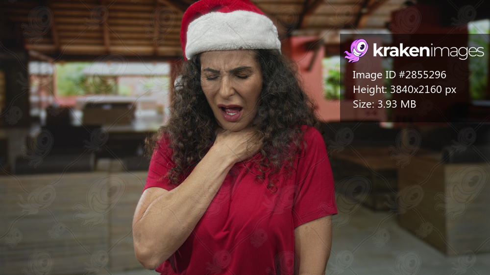 Young hispanic woman wearing santa hat clutching throat in hotel building lobby; health concern distress.