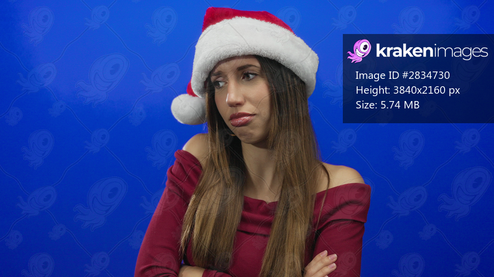 Young hispanic woman wearing santa hat crosses arms with pouting lips in blue studio; disappointment.