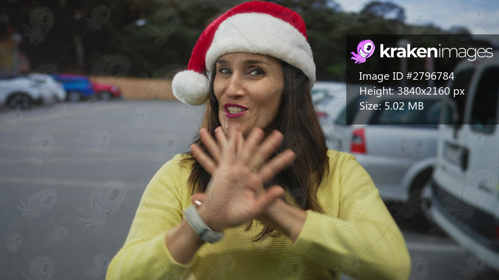 Young hispanic woman wearing santa hat shows rejection gesture with bare hands in parking lot; rejection refusal.