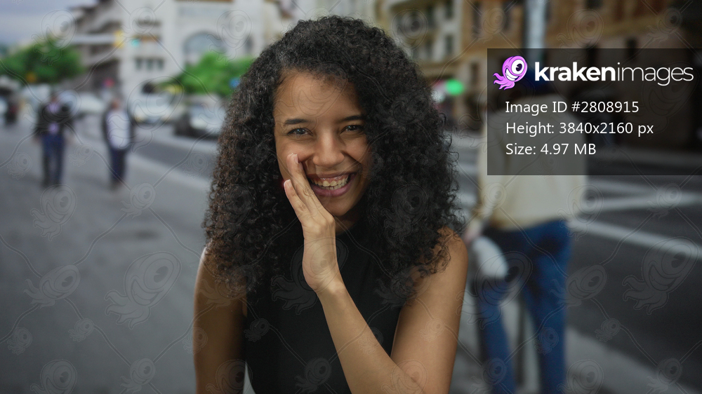 Young hispanic woman wearing sleeveless black top smiling with finger to lips for silence on busy urban street; playful secrecy.