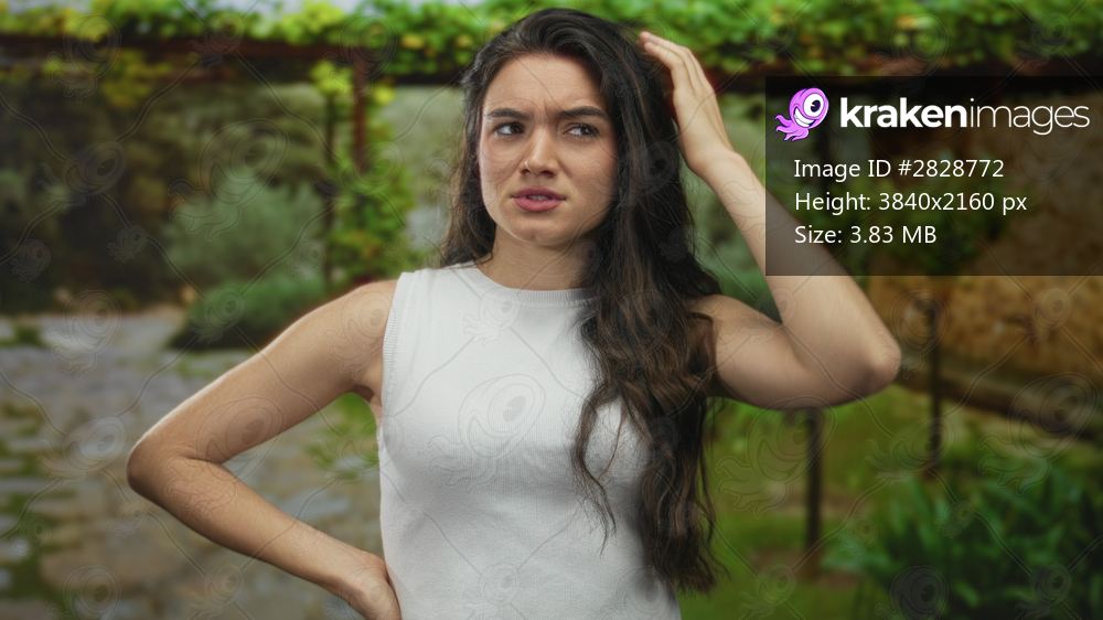 Young hispanic woman wearing sleeveless top touches her temple and frowns in a green park with vine covered pergola and stone pathway; thinking.
