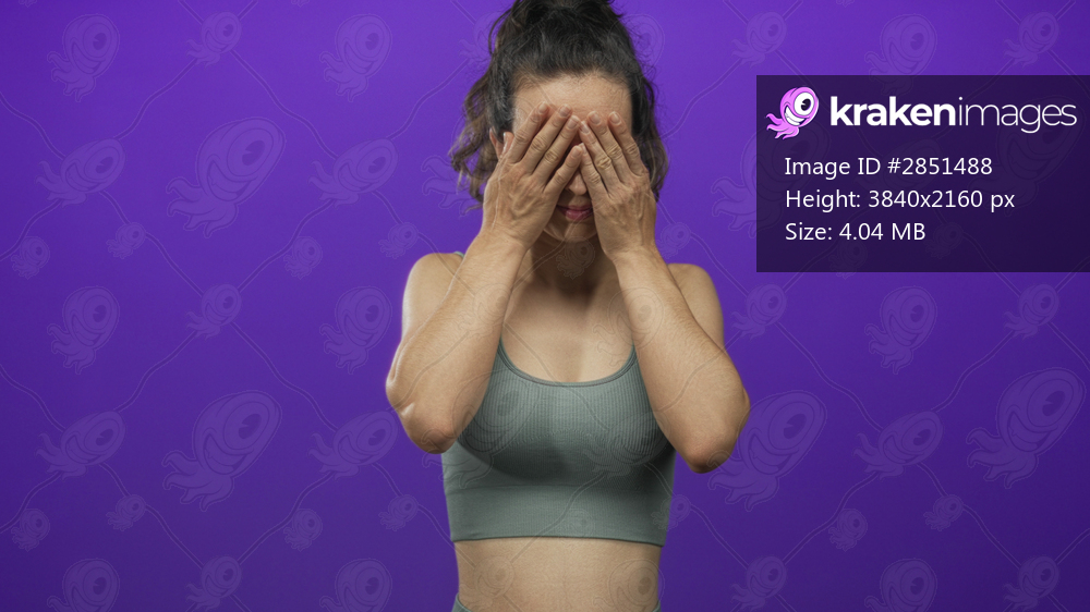 Young hispanic woman wearing sports top covers eyes with hands and peeks through fingers in purple studio; surprise.