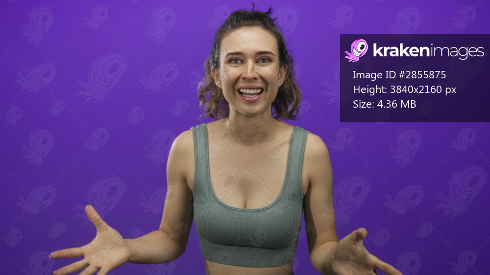 Young hispanic woman wearing sports top covers eyes with hands and peeks through fingers in purple studio; surprise.