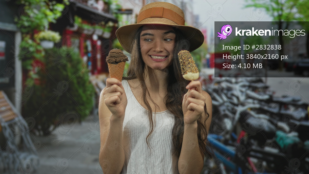 Young hispanic woman wearing straw hat holding two icecream treats with curious gaze on busy street; temptation dilemma.