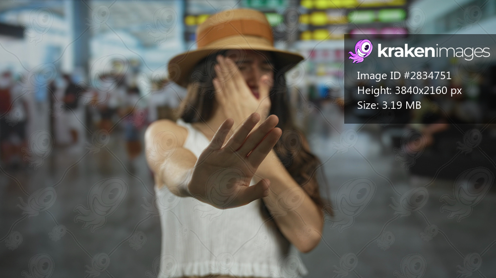 Young hispanic woman wearing straw hat holds hand to cheek with pained expression in busy airport terminal; pain.