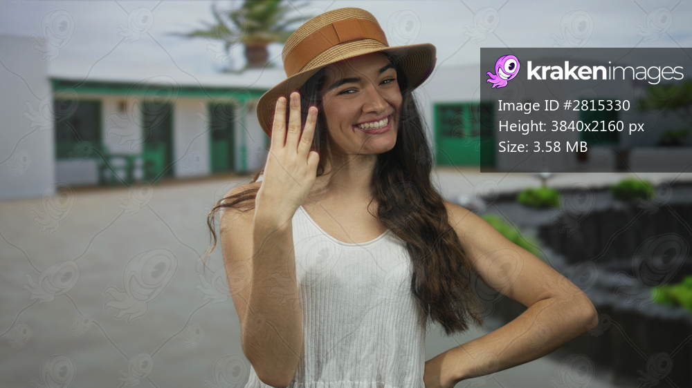 Young hispanic woman wearing straw hat and white dress counts fingers while smiling in front of building facade; learning joy.