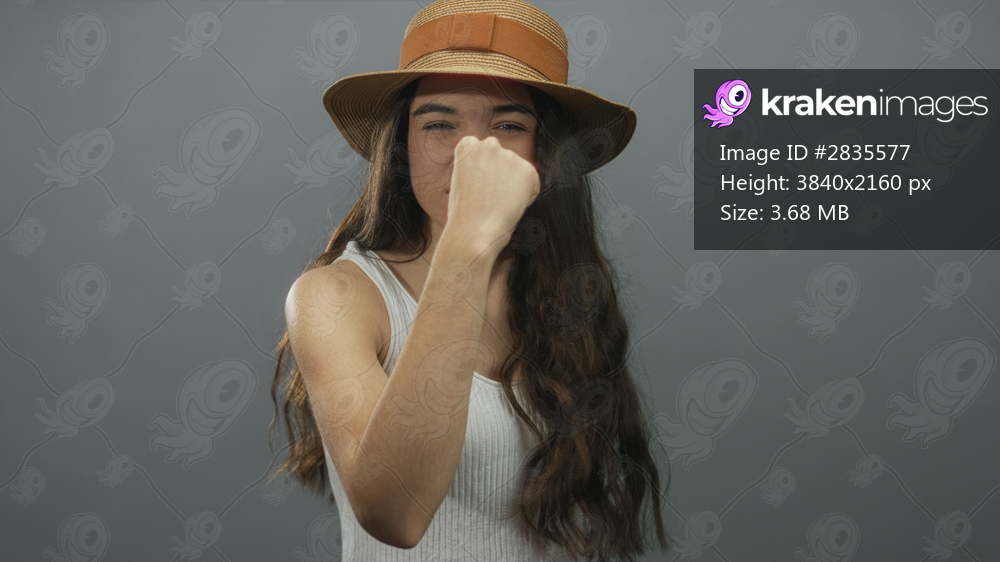 Young hispanic woman wearing straw hat and white tank top raising fist in a gray studio; determination.
