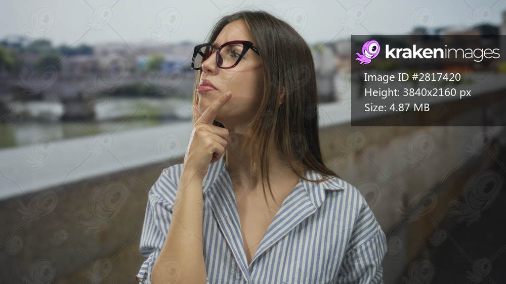 Young hispanic woman wearing striped shirt and glasses scratches her head on sunlit cobblestone street in old town; uncertainty.