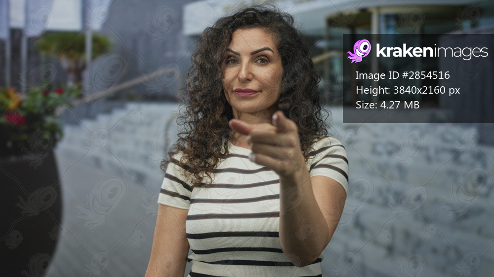 Young hispanic woman wearing striped shirt pointing finger to camera on sunlit street; confidence empowerment resilience growth.